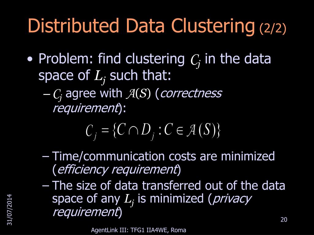 Distributed Data Clustering (2/2) • Problem: find clustering Cj in the data space of Lj such that: • Cj agree with A(S) (correctness requirement): • Time/communication costs are minimized (efficiency requirement) • The size of data transferred out of the data space of any Lj is minimized (privacy requirement) AgentLink III: TFG1 IIA4WE, Roma