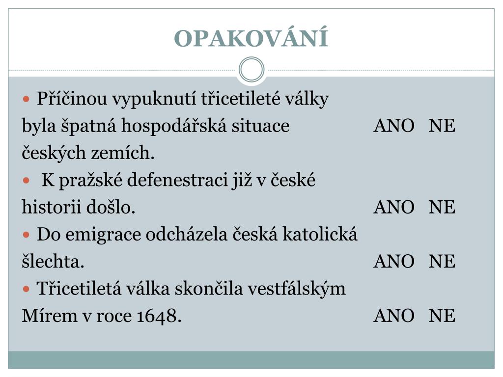 OPAKOVÁNÍ • Příčinou vypuknutí třicetileté války byla špatná hospodářská situace ANO NE českých zemích. • K pražské defenestraci již v české historii došlo. ANO NE • Do emigrace odcházela česká katolická šlechta. ANO NE • Třicetiletá válka skončila vestfálským Mírem v roce 1648. ANO NE