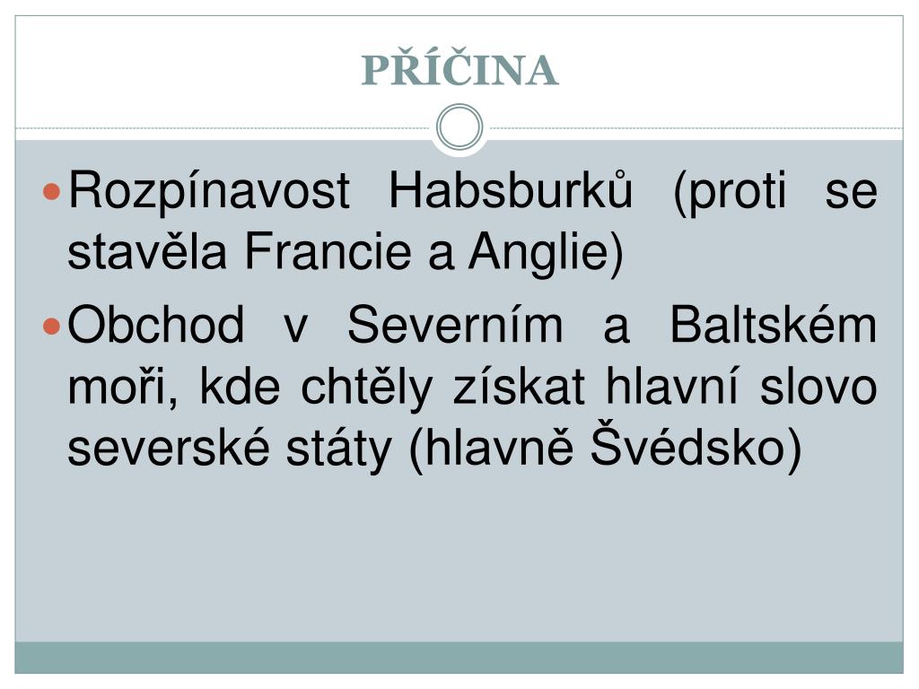 PŘÍČINA Rozpínavost Habsburků (proti se stavěla Francie a Anglie) Obchod v Severním a Baltském moři, kde chtěly získat hlavní slovo severské státy (hlavně Švédsko)