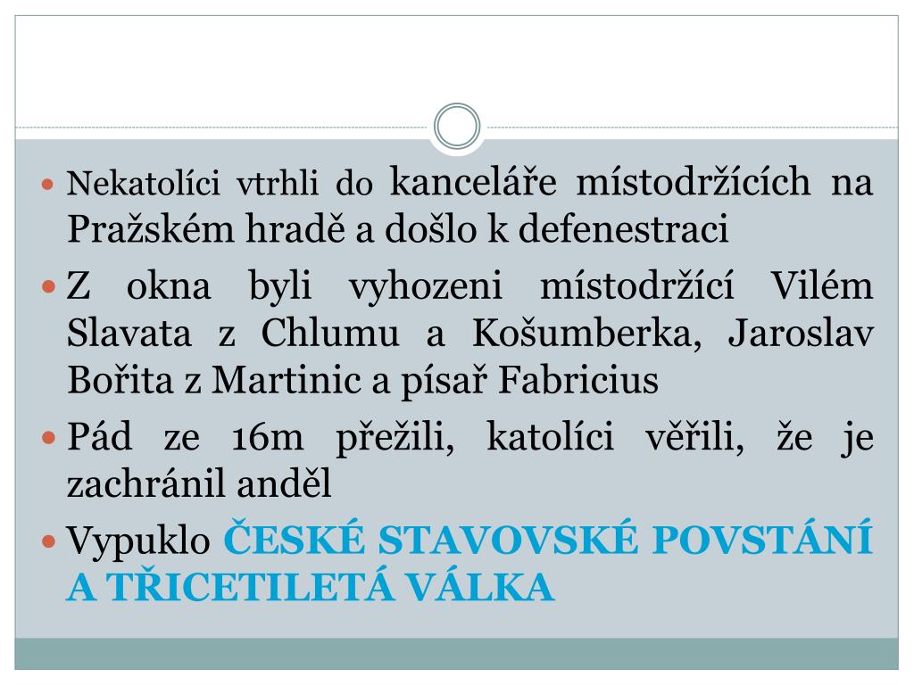 Nekatolíci vtrhli do kanceláře místodržících na Pražském hradě a došlo k defenestraci Z okna byli vyhozeni místodržící Vilém Slavata z Chlumu a Košumberka, Jaroslav Bořita z Martinic a písař Fabricius Pád ze 16m přežili, katolíci věřili, že je zachránil anděl Vypuklo ČESKÉ STAVOVSKÉ POVSTÁNÍ A TŘICETILETÁ VÁLKA