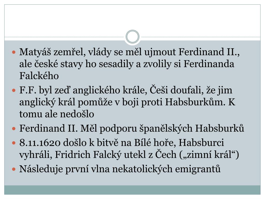 Matyáš zemřel, vlády se měl ujmout Ferdinand II., ale české stavy ho sesadily a zvolily si Ferdinanda Falckého F.F. byl zeď anglického krále, Češi doufali, že jim anglický král pomůže v boji proti Habsburkům. K tomu ale nedošlo Ferdinand II. Měl podporu španělských Habsburků 8.11.1620 došlo k bitvě na Bílé hoře, Habsburci vyhráli, Fridrich Falcký utekl z Čech („zimní král“) Následuje první vlna nekatolických emigrantů