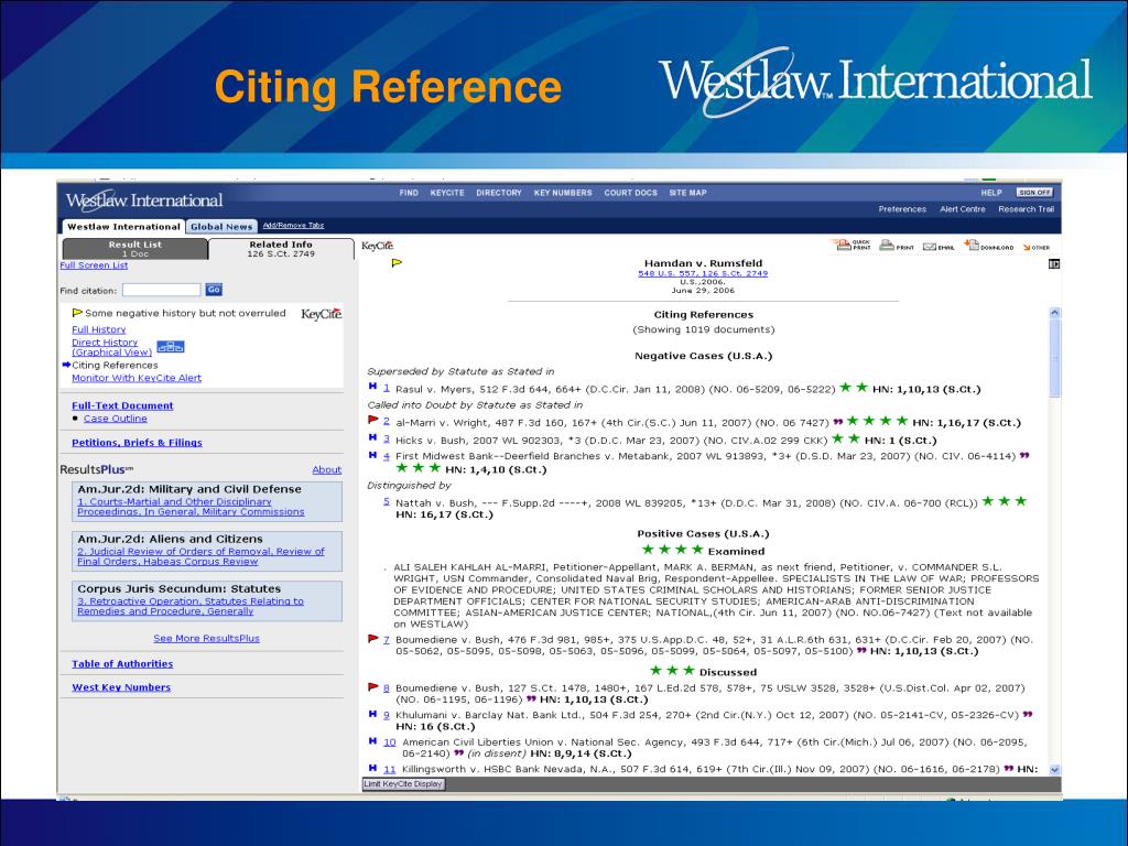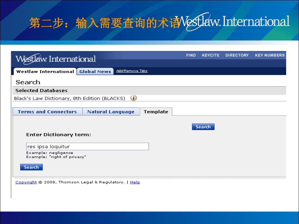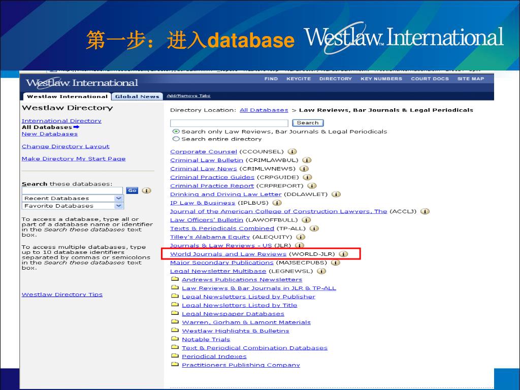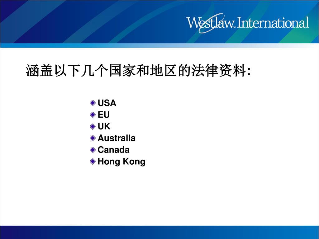 关于Westlaw • 诞生于1975年,30多年来已成为在线法律信息查询服务的领导者; • 包括Black’s Law Dictionary, American Law Reports 在内的诸多独有资源; • 超过32000个数据库, 1000余种法学专业期刊,个别数据库以每30分钟一次的速度更新; • 操作界面简单 ,资源间交叉参考功能强大; • 2008年起,为所有用户(包括试用)提供电子期刊导航。