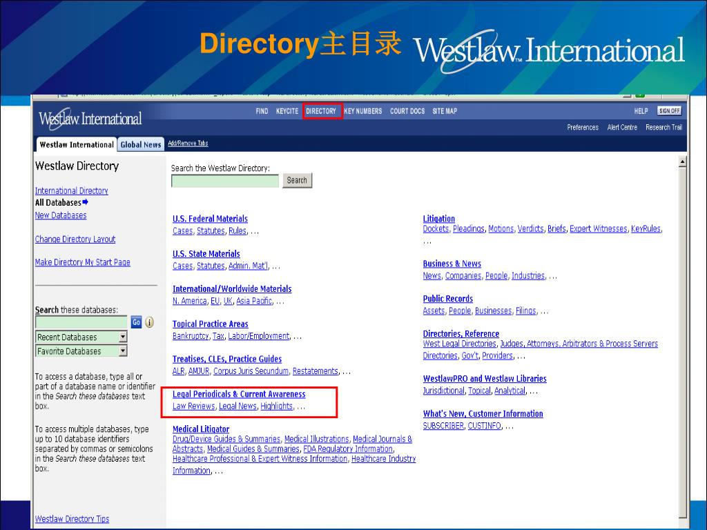 第三种检索方法:Directory 主目录检索法 • 浏览Westlaw中全部的资源目录; • 直接点击一级目录,逐级展开,选择进入特定数据库; • 在该数据库中通过输入检索词进行检索。 以检索法学期刊的文章和成文法为例