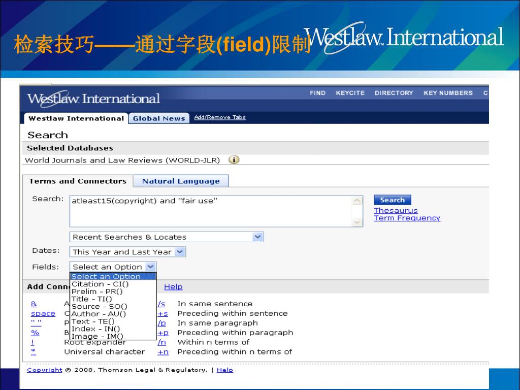 ! 字根扩展号,检索不同结尾的字词 Negligen! * 代替某一个字母 Crimin*l % But not 文件中不可包含%后面的字词 Euthanasia % suicide Atleast n( ) 括号中的字词必须在文件中最少出现n次 Atleast10(anti-trust) Connectors连接符