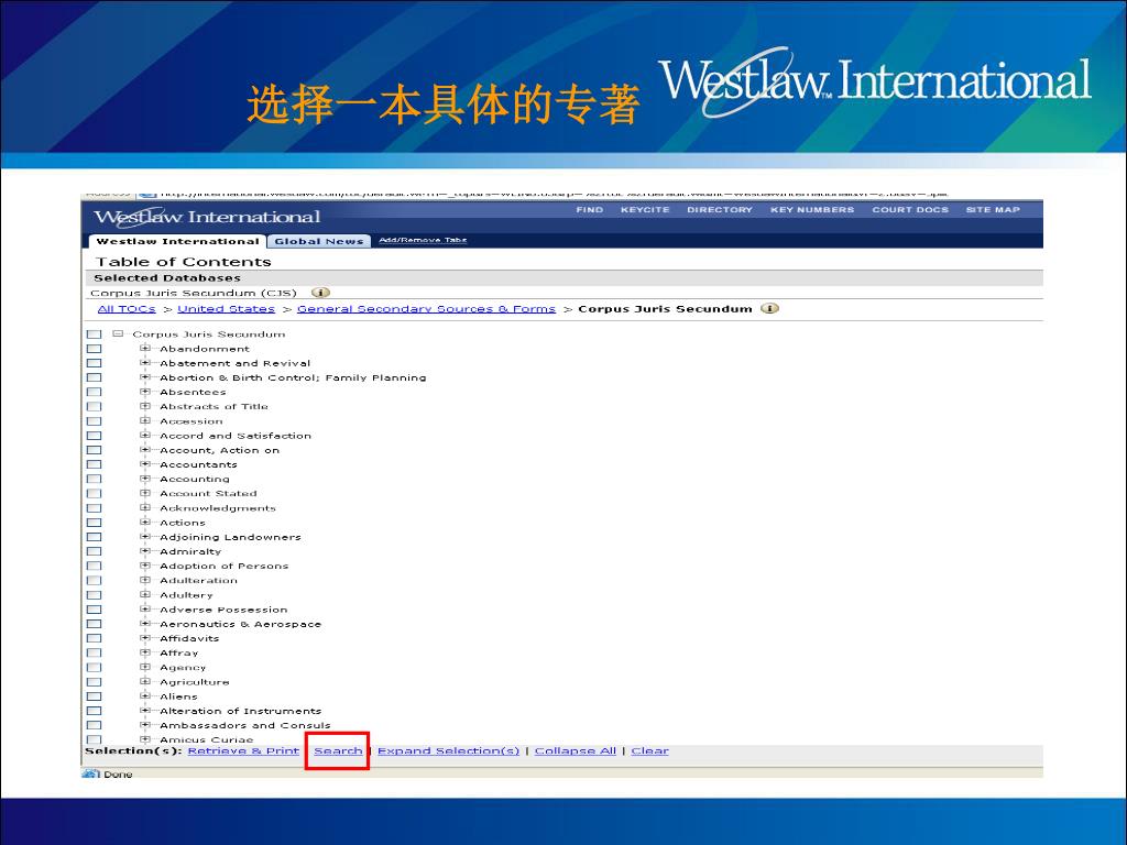 五种检索方法 • Find:输入已知文件的引称(citation),直接检索出唯一结果; • Table of Content:无需进行检索,直接按国别阅览成文法和专著; • Directory:由主目录进入某数据库,进行检索; • Search these database:直接唤出某数据库,在该库中进行检索; • Key Number:逐级展开各个法律主题(legal topic),进行检索。