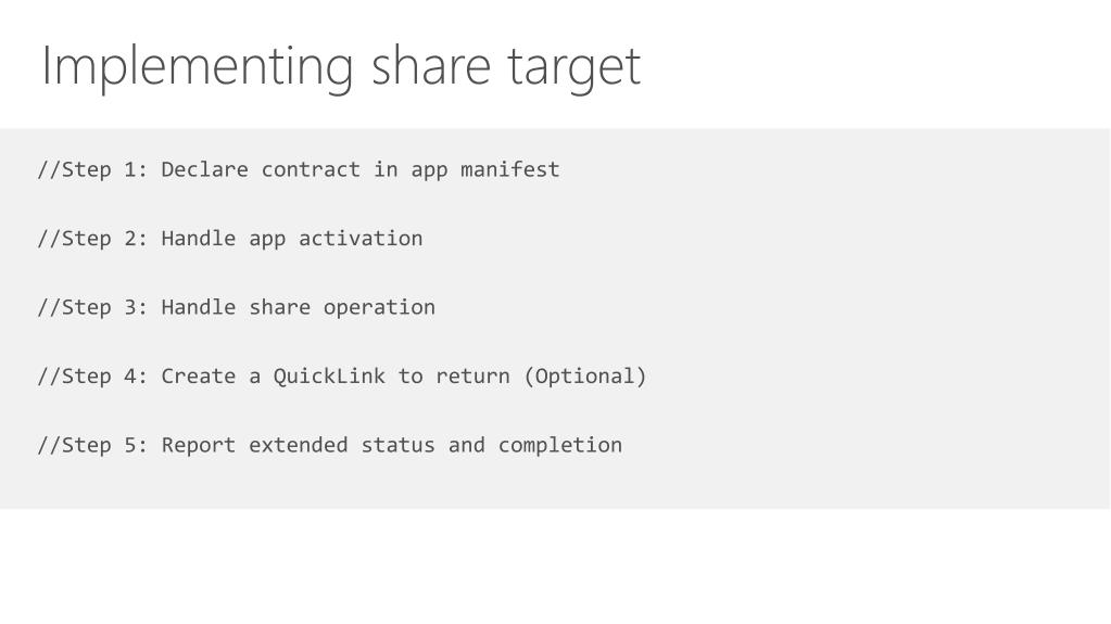 Implementing share target • //Step 1: Declare contract in app manifest • //Step 2: Handle app activation • //Step 3: Handle share operation • //Step 4: Create a QuickLink to return (Optional) • //Step 5: Report extended status and completion