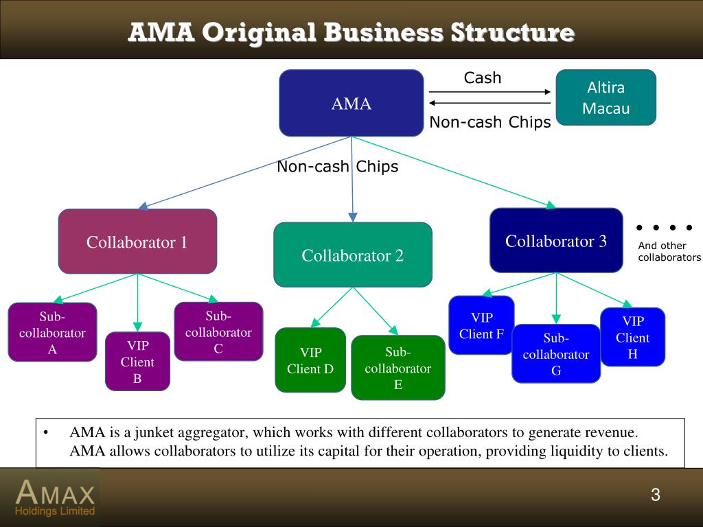 AMA Original Business Structure Cash AMA Altira Macau Non-cash Chips Non-cash Chips Collaborator 3 Collaborator 1 Collaborator 2 And other collaborators VIP Client F Sub-collaborator C Sub-collaborator A VIP Client H Sub-collaborator G VIP Client D VIP Client B Sub-collaborator E AMA is a junket aggregator, which works with different collaborators to generate revenue. AMA allows collaborators to utilize its capital for their operation, providing liquidity to clients.
