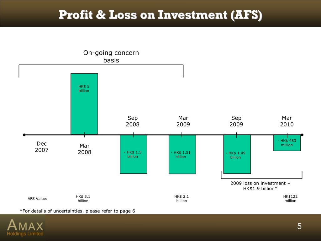 On-going concern basis Profit & Loss on Investment (AFS) HK$ 5 billion Sep 2008 Mar 2009 Sep 2009 Mar 2010 - HK$ 483 million Dec 2007 Mar 2008 - HK$ 1.5 billion - HK$ 1.51 billion - HK$ 1.49 billion 2009 loss on investment – HK$1.9 billion* HK$ 2.1 billion HK$122 million HK$ 5.1 billion AFS Value: *For details of uncertainties, please refer to page 6