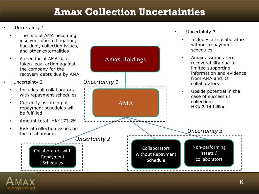 Amax Collection Uncertainties • Uncertainty 1 • The risk of AMA becoming insolvent due to litigation, bad debt, collection issues, and other externalities • A creditor of AMA has taken legal action against the company for the recovery debts due by AMA • Uncertainty 2 • Includes all collaborators with repayment schedules • Currently assuming all repayment schedules will be fulfilled • Amount total: HK$173.2M • Risk of collection issues on the total amount • Uncertainty 3 • Includes all collaborators without repayment schedules • Amax assumes zero recoverability due to limited supporting information and evidence from AMA and its collaborators • Upside potential in the case of successful collection: HK$ 2.14 billion Amax Holdings Uncertainty 1 AMA Uncertainty 3 Uncertainty 2 Collaborators without Repayment Schedule Non-performing assets / collaborators Collaborators with Repayment Schedules