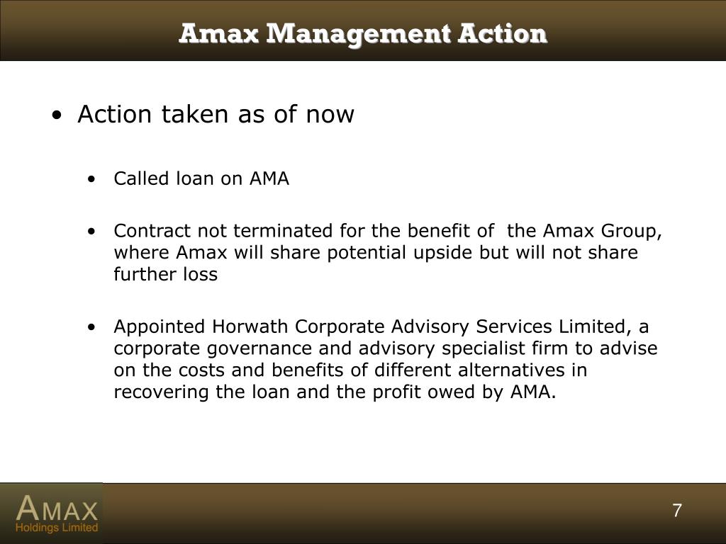 Amax Management Action • Action taken as of now • Called loan on AMA • Contract not terminated for the benefit of the Amax Group, where Amax will share potential upside but will not share further loss • Appointed Horwath Corporate Advisory Services Limited, a corporate governance and advisory specialist firm to advise on the costs and benefits of different alternatives in recovering the loan and the profit owed by AMA.