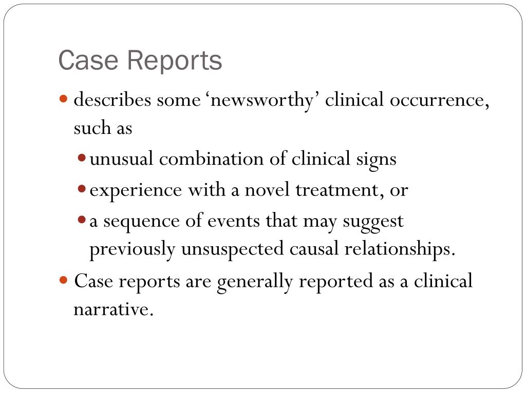 Case Reports • describes some ‘newsworthy’ clinical occurrence, such as • unusual combinationof clinical signs • experience with a novel treatment, or • a sequence of events thatmay suggest previously unsuspected causal relationships. • Case reports are generallyreported as a clinical narrative.