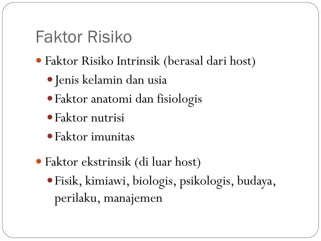 Faktor Risiko • Faktor Risiko Intrinsik (berasal dari host) • Jenis kelamin dan usia • Faktor anatomi dan fisiologis • Faktor nutrisi • Faktor imunitas • Faktor ekstrinsik (di luar host) • Fisik, kimiawi, biologis, psikologis, budaya, perilaku, manajemen