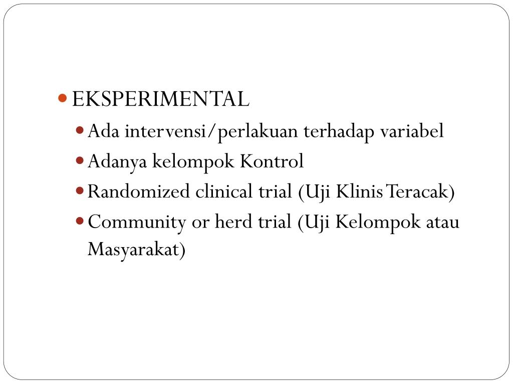 EKSPERIMENTAL • Ada intervensi/perlakuan terhadap variabel • Adanya kelompok Kontrol • Randomized clinical trial (Uji Klinis Teracak) • Community or herd trial (Uji Kelompok atau Masyarakat)