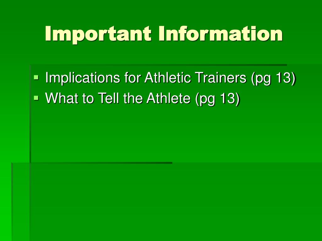 Important Information • Implications for Athletic Trainers (pg 13) • What to Tell the Athlete (pg 13)