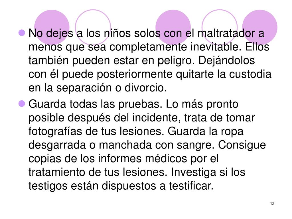 No dejes a los niños solos con el maltratador a menos que sea completamente inevitable. Ellos también pueden estar en peligro. Dejándolos con él puede posteriormente quitarte la custodia en la separación o divorcio. • Guarda todas las pruebas. Lo más pronto posible después del incidente, trata de tomar fotografías de tus lesiones. Guarda la ropa desgarrada o manchada con sangre. Consigue copias de los informes médicos por el tratamiento de tus lesiones. Investiga si los testigos están dispuestos a testificar.