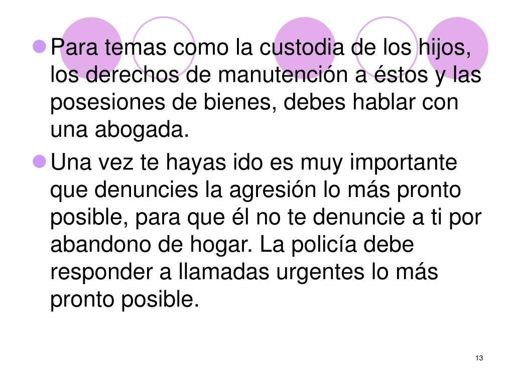 Para temas como la custodia de los hijos, los derechos de manutención a éstos y las posesiones de bienes, debes hablar con una abogada. • Una vez te hayas ido es muy importante que denuncies la agresión lo más pronto posible, para que él no te denuncie a ti por abandono de hogar. La policía debe responder a llamadas urgentes lo más pronto posible.