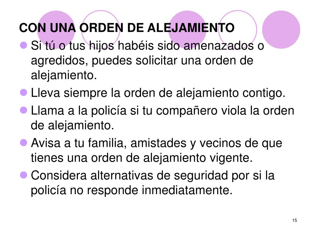 CON UNA ORDEN DE ALEJAMIENTO • Si tú o tus hijos habéis sido amenazados o agredidos, puedes solicitar una orden de alejamiento. • Lleva siempre la orden de alejamiento contigo. • Llama a la policía si tu compañero viola la orden de alejamiento. • Avisa a tu familia, amistades y vecinos de que tienes una orden de alejamiento vigente. • Considera alternativas de seguridad por si la policía no responde inmediatamente.