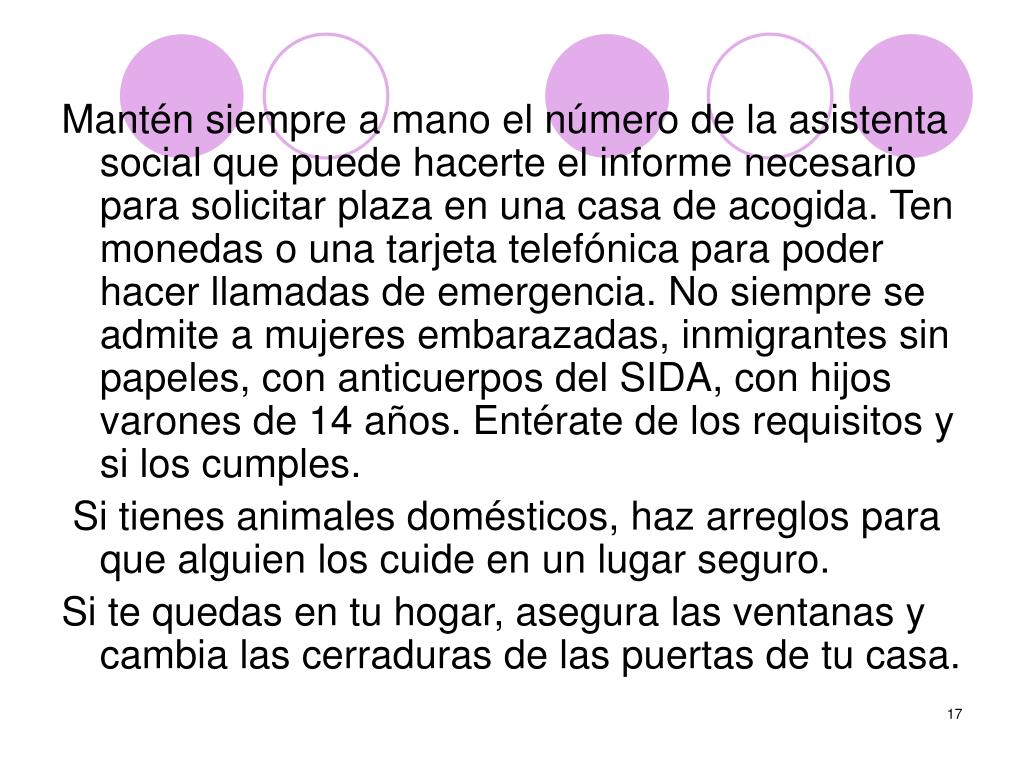 Mantén siempre a mano el número de la asistenta social que puede hacerte el informe necesario para solicitar plaza en una casa de acogida. Ten monedas o una tarjeta telefónica para poder hacer llamadas de emergencia. No siempre se admite a mujeres embarazadas, inmigrantes sin papeles, con anticuerpos del SIDA, con hijos varones de 14 años. Entérate de los requisitos y si los cumples. Si tienes animales domésticos, haz arreglos para que alguien los cuide en un lugar seguro. Si te quedas en tu hogar, asegura las ventanas y cambia las cerraduras de las puertas de tu casa.
