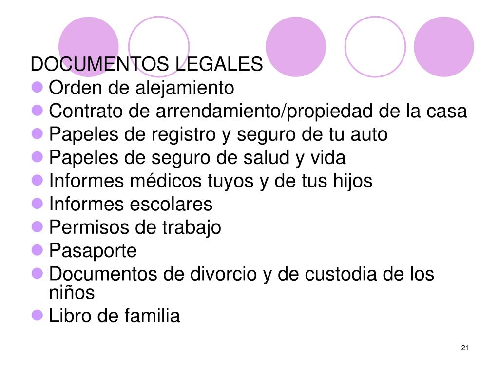 DOCUMENTOS LEGALES • Orden de alejamiento • Contrato de arrendamiento/propiedad de la casa • Papeles de registro y seguro de tu auto • Papeles de seguro de salud y vida • Informes médicos tuyos y de tus hijos • Informes escolares • Permisos de trabajo • Pasaporte • Documentos de divorcio y de custodia de los niños • Libro de familia