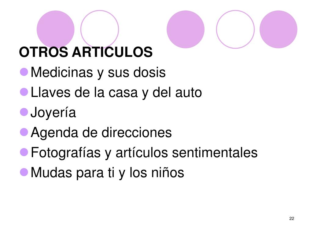 OTROS ARTICULOS • Medicinas y sus dosis • Llaves de la casa y del auto • Joyería • Agenda de direcciones • Fotografías y artículos sentimentales • Mudas para ti y los niños