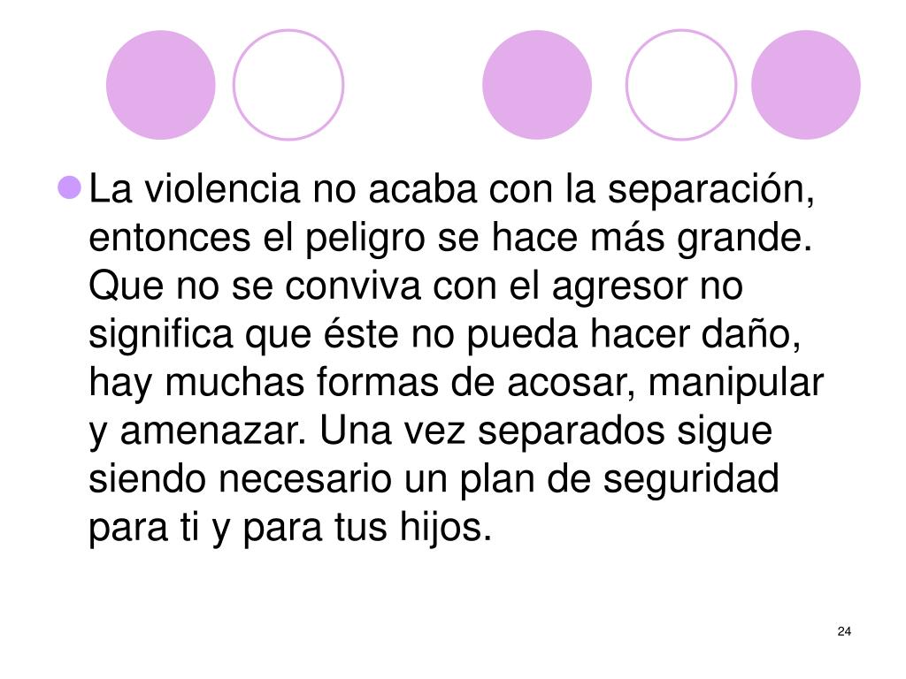 La violencia no acaba con la separación, entonces el peligro se hace más grande. Que no se conviva con el agresor no significa que éste no pueda hacer daño, hay muchas formas de acosar, manipular y amenazar. Una vez separados sigue siendo necesario un plan de seguridad para ti y para tus hijos.