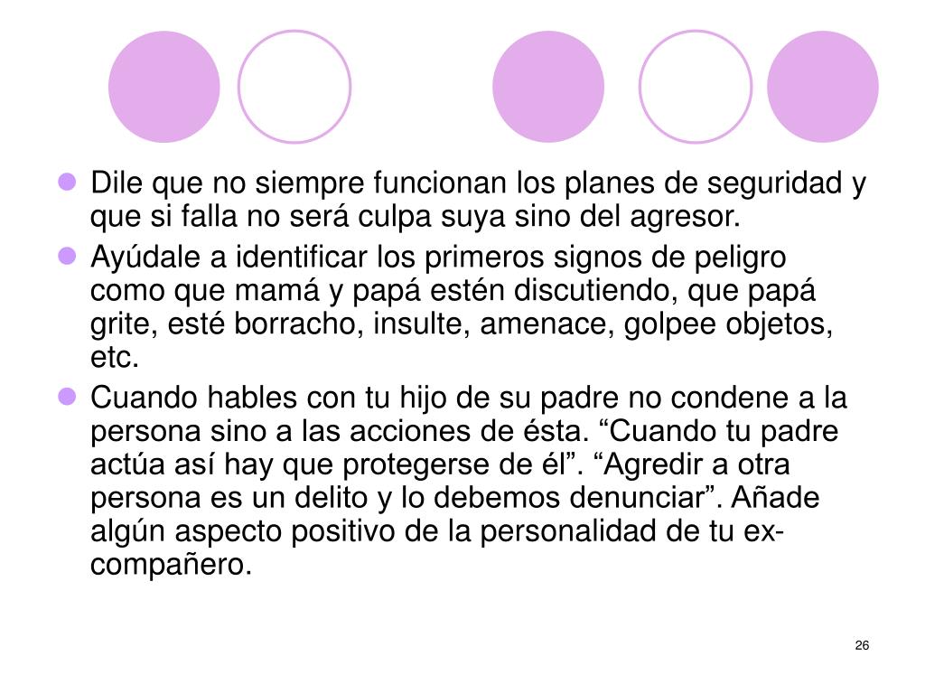 Dile que no siempre funcionan los planes de seguridad y que si falla no será culpa suya sino del agresor. • Ayúdale a identificar los primeros signos de peligro como que mamá y papá estén discutiendo, que papá grite, esté borracho, insulte, amenace, golpee objetos, etc. • Cuando hables con tu hijo de su padre no condene a la persona sino a las acciones de ésta. “Cuando tu padre actúa así hay que protegerse de él”. “Agredir a otra persona es un delito y lo debemos denunciar”. Añade algún aspecto positivo de la personalidad de tu ex-compañero.