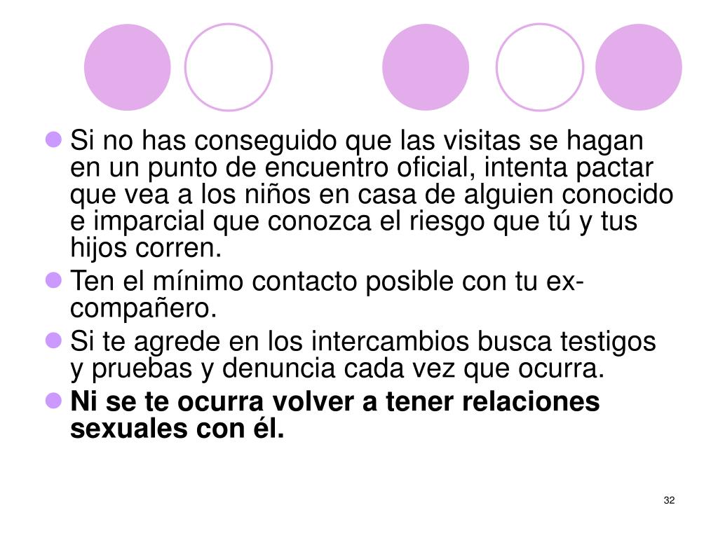 Si no has conseguido que las visitas se hagan en un punto de encuentro oficial, intenta pactar que vea a los niños en casa de alguien conocido e imparcial que conozca el riesgo que tú y tus hijos corren. • Ten el mínimo contacto posible con tu ex-compañero. • Si te agrede en los intercambios busca testigos y pruebas y denuncia cada vez que ocurra. • Ni se te ocurra volver a tener relaciones sexuales con él.