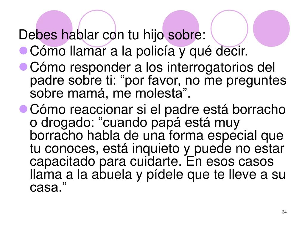 Debes hablar con tu hijo sobre: • Cómo llamar a la policía y qué decir. • Cómo responder a los interrogatorios del padre sobre ti: “por favor, no me preguntes sobre mamá, me molesta”. • Cómo reaccionar si el padre está borracho o drogado: “cuando papá está muy borracho habla de una forma especial que tu conoces, está inquieto y puede no estar capacitado para cuidarte. En esos casos llama a la abuela y pídele que te lleve a su casa.”