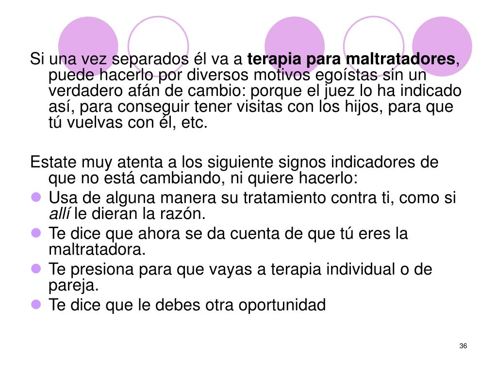 Si una vez separados él va a terapia para maltratadores, puede hacerlo por diversos motivos egoístas sin un verdadero afán de cambio: porque el juez lo ha indicado así, para conseguir tener visitas con los hijos, para que tú vuelvas con él, etc. Estate muy atenta a los siguiente signos indicadores de que no está cambiando, ni quiere hacerlo: • Usa de alguna manera su tratamiento contra ti, como si allí le dieran la razón. • Te dice que ahora se da cuenta de que tú eres la maltratadora. • Te presiona para que vayas a terapia individual o de pareja. • Te dice que le debes otra oportunidad