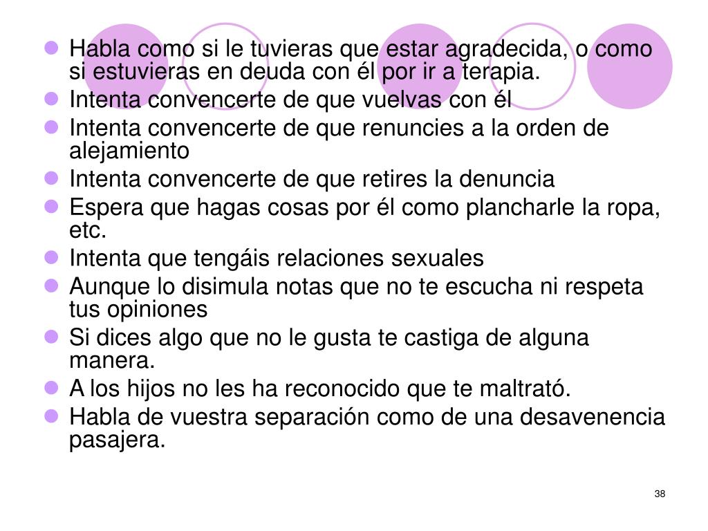 Habla como si le tuvieras que estar agradecida, o como si estuvieras en deuda con él por ir a terapia. • Intenta convencerte de que vuelvas con él • Intenta convencerte de que renuncies a la orden de alejamiento • Intenta convencerte de que retires la denuncia • Espera que hagas cosas por él como plancharle la ropa, etc. • Intenta que tengáis relaciones sexuales • Aunque lo disimula notas que no te escucha ni respeta tus opiniones • Si dices algo que no le gusta te castiga de alguna manera. • A los hijos no les ha reconocido que te maltrató. • Habla de vuestra separación como de una desavenencia pasajera.