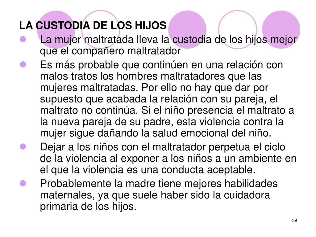 LA CUSTODIA DE LOS HIJOS • La mujer maltratada lleva la custodia de los hijos mejor que el compañero maltratador • Es más probable que continúen en una relación con malos tratos los hombres maltratadores que las mujeres maltratadas. Por ello no hay que dar por supuesto que acabada la relación con su pareja, el maltrato no continúa. Si el niño presencia el maltrato a la nueva pareja de su padre, esta violencia contra la mujer sigue dañando la salud emocional del niño. • Dejar a los niños con el maltratador perpetua el ciclo de la violencia al exponer a los niños a un ambiente en el que la violencia es una conducta aceptable. • Probablemente la madre tiene mejores habilidades maternales, ya que suele haber sido la cuidadora primaria de los hijos.