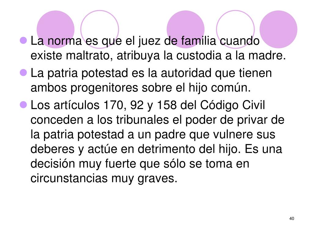 La norma es que el juez de familia cuando existe maltrato, atribuya la custodia a la madre. • La patria potestad es la autoridad que tienen ambos progenitores sobre el hijo común. • Los artículos 170, 92 y 158 del Código Civil conceden a los tribunales el poder de privar de la patria potestad a un padre que vulnere sus deberes y actúe en detrimento del hijo. Es una decisión muy fuerte que sólo se toma en circunstancias muy graves.