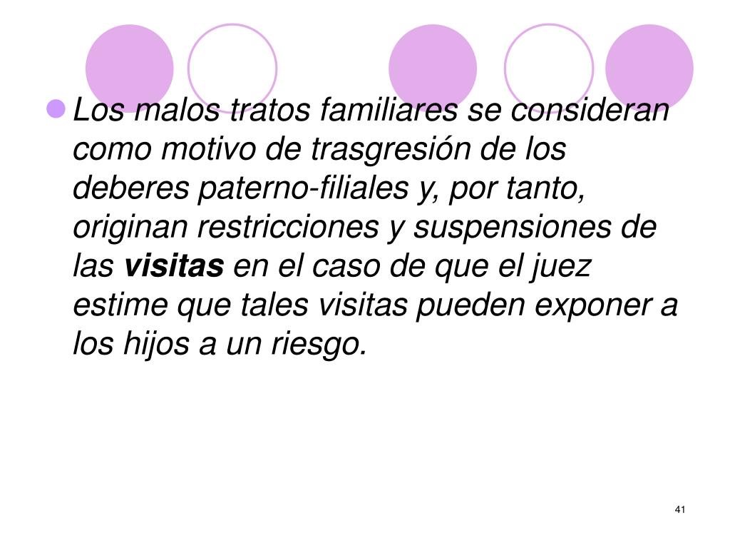 Los malos tratos familiares se consideran como motivo de trasgresión de los deberes paterno-filiales y, por tanto, originan restricciones y suspensiones de las visitas en el caso de que el juez estime que tales visitas pueden exponer a los hijos a un riesgo.
