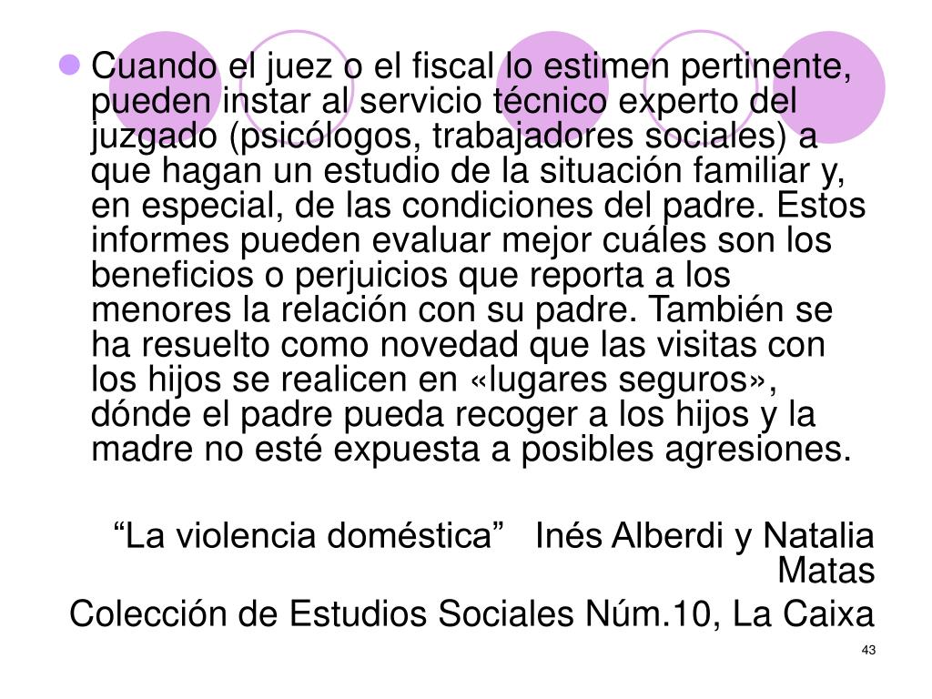 Cuando el juez o el fiscal lo estimen pertinente, pueden instar al servicio técnico experto del juzgado (psicólogos, trabajadores sociales) a que hagan un estudio de la situación familiar y, en especial, de las condiciones del padre. Estos informes pueden evaluar mejor cuáles son los beneficios o perjuicios que reporta a los menores la relación con su padre. También se ha resuelto como novedad que las visitas con los hijos se realicen en «lugares seguros», dónde el padre pueda recoger a los hijos y la madre no esté expuesta a posibles agresiones. “La violencia doméstica” Inés Alberdi y Natalia Matas Colección de Estudios Sociales Núm.10, La Caixa