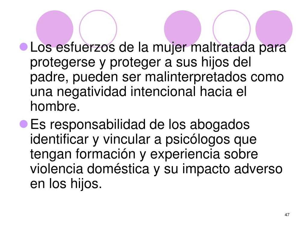 Los esfuerzos de la mujer maltratada para protegerse y proteger a sus hijos del padre, pueden ser malinterpretados como una negatividad intencional hacia el hombre. • Es responsabilidad de los abogados identificar y vincular a psicólogos que tengan formación y experiencia sobre violencia doméstica y su impacto adverso en los hijos.