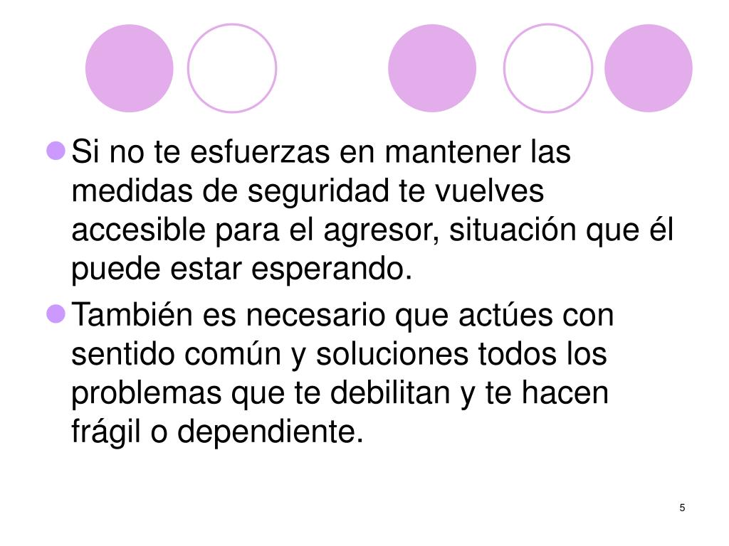 Si no te esfuerzas en mantener las medidas de seguridad te vuelves accesible para el agresor, situación que él puede estar esperando. • También es necesario que actúes con sentido común y soluciones todos los problemas que te debilitan y te hacen frágil o dependiente.