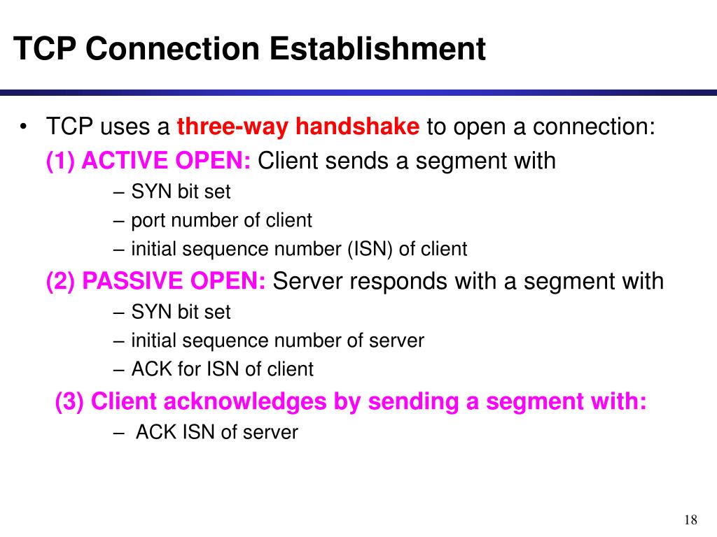 TCP Connection Establishment • TCP uses a three-way handshake to open a connection: (1) ACTIVE OPEN: Client sends a segment with • SYN bit set • port number of client • initial sequence number (ISN) of client (2) PASSIVE OPEN: Server responds with a segment with • SYN bit set • initial sequence number of server • ACK for ISN of client (3) Client acknowledges by sending a segment with: • ACK ISN of server