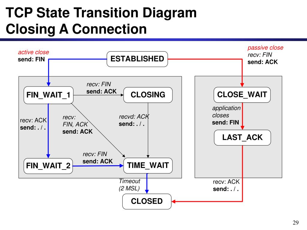 2MSL Wait State 2MSL Wait State = TIME_WAIT • When TCP does an active close, and sends the final ACK, the connection must stay in in the TIME_WAIT state for twice the maximum segment lifetime. 2MSL= 2 * Maximum Segment Lifetime • Why? TCP is given a chance to resend the final ACK. (Server will timeout after sending the FIN segment and resend the FIN) • The MSL is set to 2 minutes or 1 minute or 30 seconds.