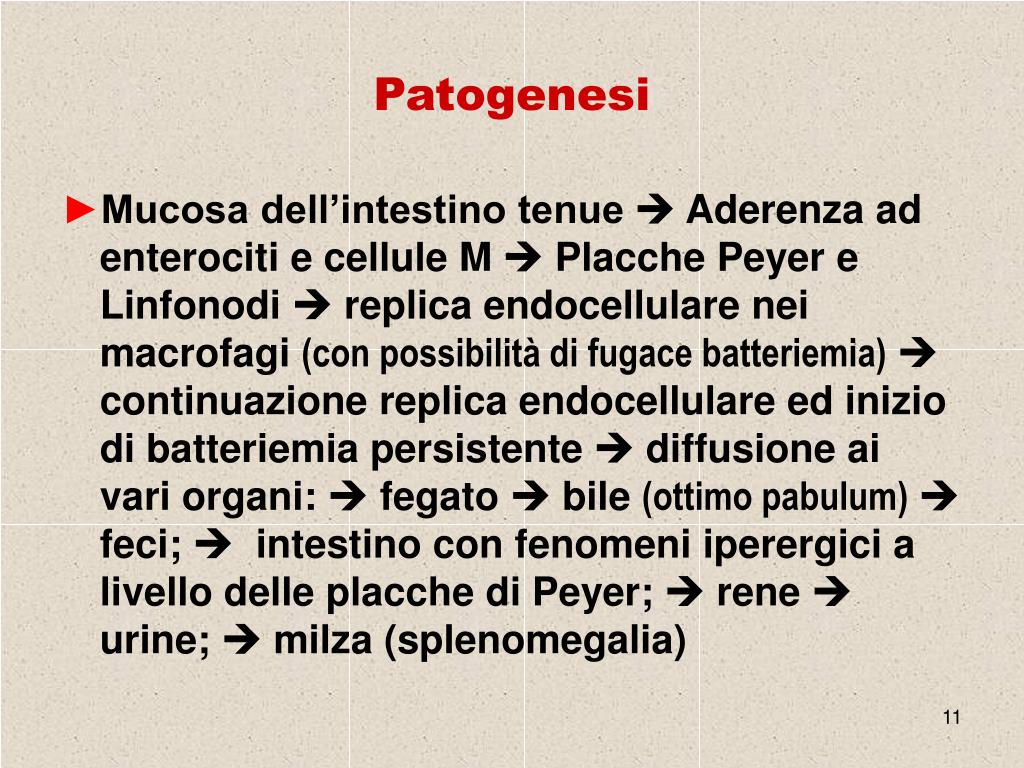 Patogenesi • Mucosa dell’intestino tenue Aderenza ad enterociti e cellule M Placche Peyer e Linfonodi replica endocellulare nei macrofagi (con possibilità di fugace batteriemia) continuazione replica endocellulare ed inizio di batteriemia persistente diffusione ai vari organi: fegato bile (ottimo pabulum) feci; intestino con fenomeni iperergici a livello delle placche di Peyer; rene urine; milza (splenomegalia)