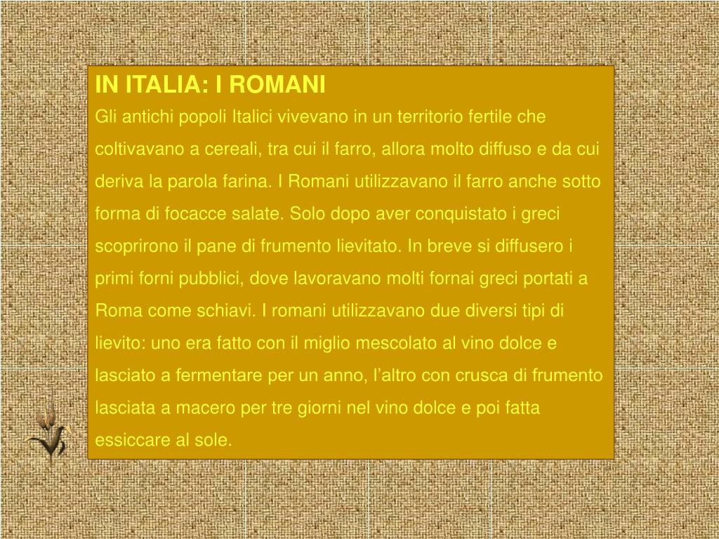 IN ITALIA: I ROMANI Gli antichi popoli Italici vivevano in un territorio fertile che coltivavano a cereali, tra cui il farro, allora molto diffuso e da cui deriva la parola farina. I Romani utilizzavano il farro anche sotto forma di focacce salate. Solo dopo aver conquistato i greci scoprirono il pane di frumento lievitato. In breve si diffusero i primi forni pubblici, dove lavoravano molti fornai greci portati a Roma come schiavi. I romani utilizzavano due diversi tipi di lievito: uno era fatto con il miglio mescolato al vino dolce e lasciato a fermentare per un anno, l’altro con crusca di frumento lasciata a macero per tre giorni nel vino dolce e poi fatta essiccare al sole.