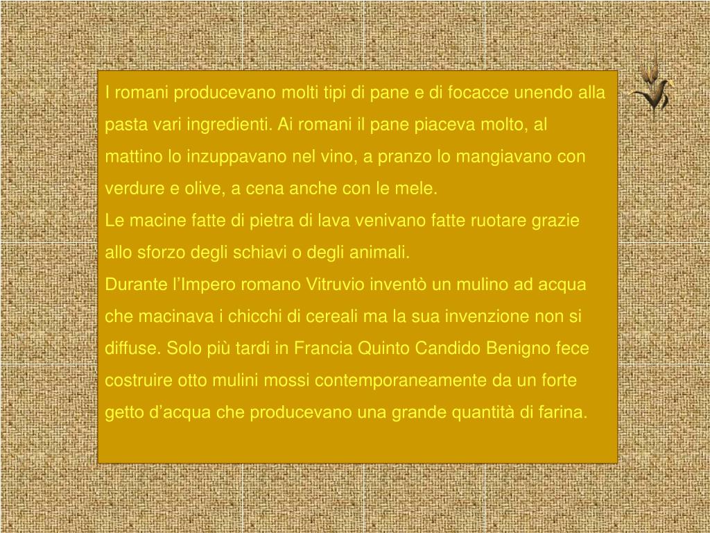 I romani producevano molti tipi di pane e di focacce unendo alla pasta vari ingredienti. Ai romani il pane piaceva molto, al mattino lo inzuppavano nel vino, a pranzo lo mangiavano con verdure e olive, a cena anche con le mele. Le macine fatte di pietra di lava venivano fatte ruotare grazie allo sforzo degli schiavi o degli animali. Durante l’Impero romano Vitruvio inventò un mulino ad acqua che macinava i chicchi di cereali ma la sua invenzione non si diffuse. Solo più tardi in Francia Quinto Candido Benigno fece costruire otto mulini mossi contemporaneamente da un forte getto d’acqua che producevano una grande quantità di farina.