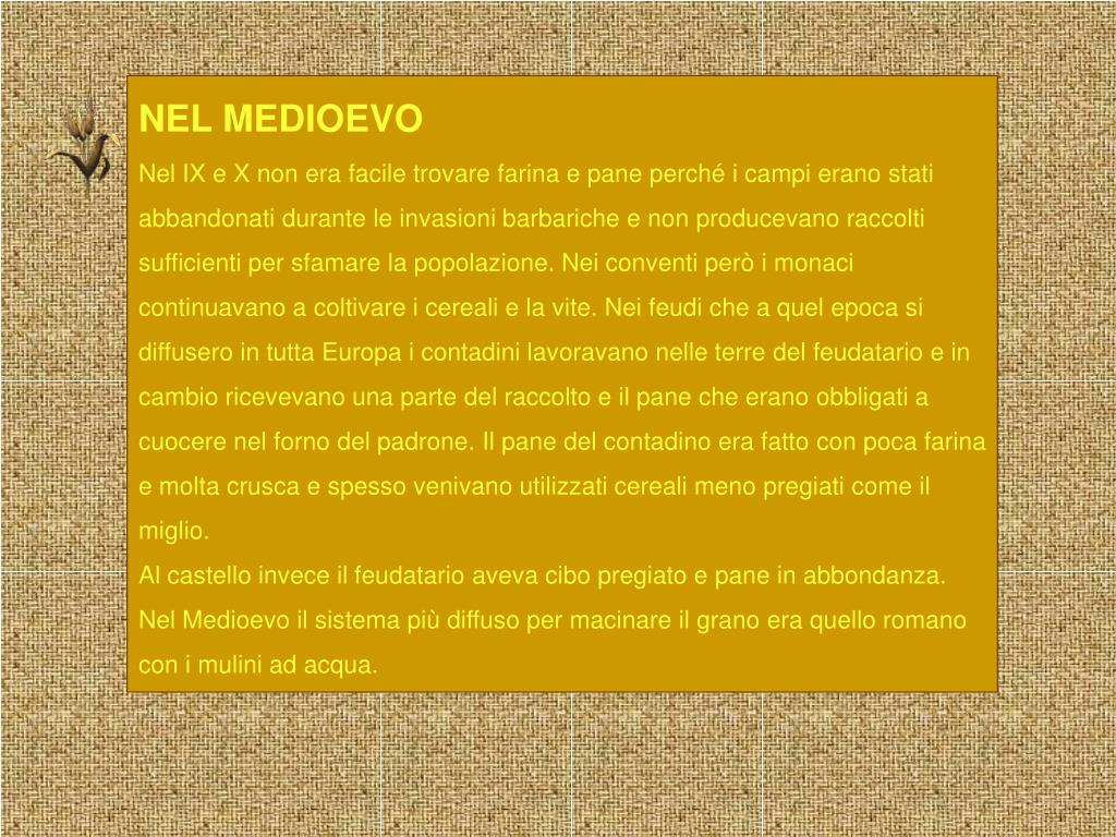 NEL MEDIOEVO Nel IX e X non era facile trovare farina e pane perché i campi erano stati abbandonati durante le invasioni barbariche e non producevano raccolti sufficienti per sfamare la popolazione. Nei conventi però i monaci continuavano a coltivare i cereali e la vite. Nei feudi che a quel epoca si diffusero in tutta Europa i contadini lavoravano nelle terre del feudatario e in cambio ricevevano una parte del raccolto e il pane che erano obbligati a cuocere nel forno del padrone. Il pane del contadino era fatto con poca farina e molta crusca e spesso venivano utilizzati cereali meno pregiati come il miglio. Al castello invece il feudatario aveva cibo pregiato e pane in abbondanza. Nel Medioevo il sistema più diffuso per macinare il grano era quello romano con i mulini ad acqua.
