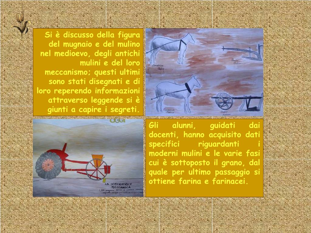 Si è discusso della figura del mugnaio e del mulino nel medioevo, degli antichi mulini e del loro meccanismo; questi ultimi sono stati disegnati e di loro reperendo informazioni attraverso leggende si è giunti a capire i segreti. Gli alunni, guidati dai docenti, hanno acquisito dati specifici riguardanti i moderni mulini e le varie fasi cui è sottoposto il grano, dal quale per ultimo passaggio si ottiene farina e farinacei.