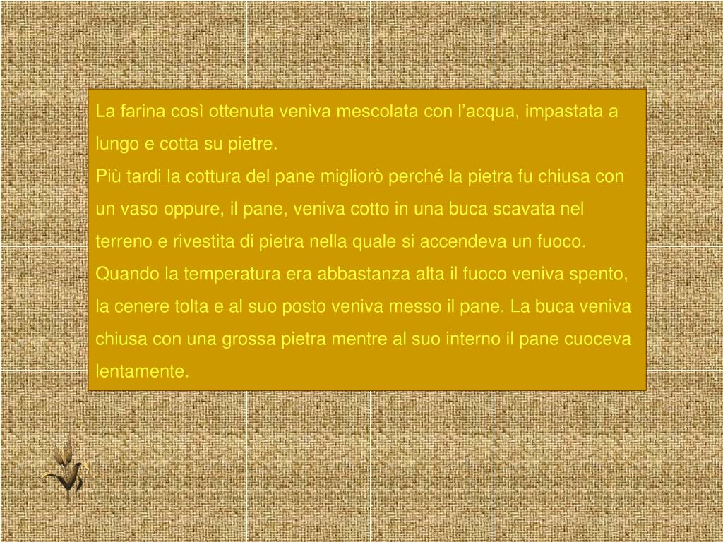 La farina così ottenuta veniva mescolata con l’acqua, impastata a lungo e cotta su pietre. Più tardi la cottura del pane migliorò perché la pietra fu chiusa con un vaso oppure, il pane, veniva cotto in una buca scavata nel terreno e rivestita di pietra nella quale si accendeva un fuoco. Quando la temperatura era abbastanza alta il fuoco veniva spento, la cenere tolta e al suo posto veniva messo il pane. La buca veniva chiusa con una grossa pietra mentre al suo interno il pane cuoceva lentamente.
