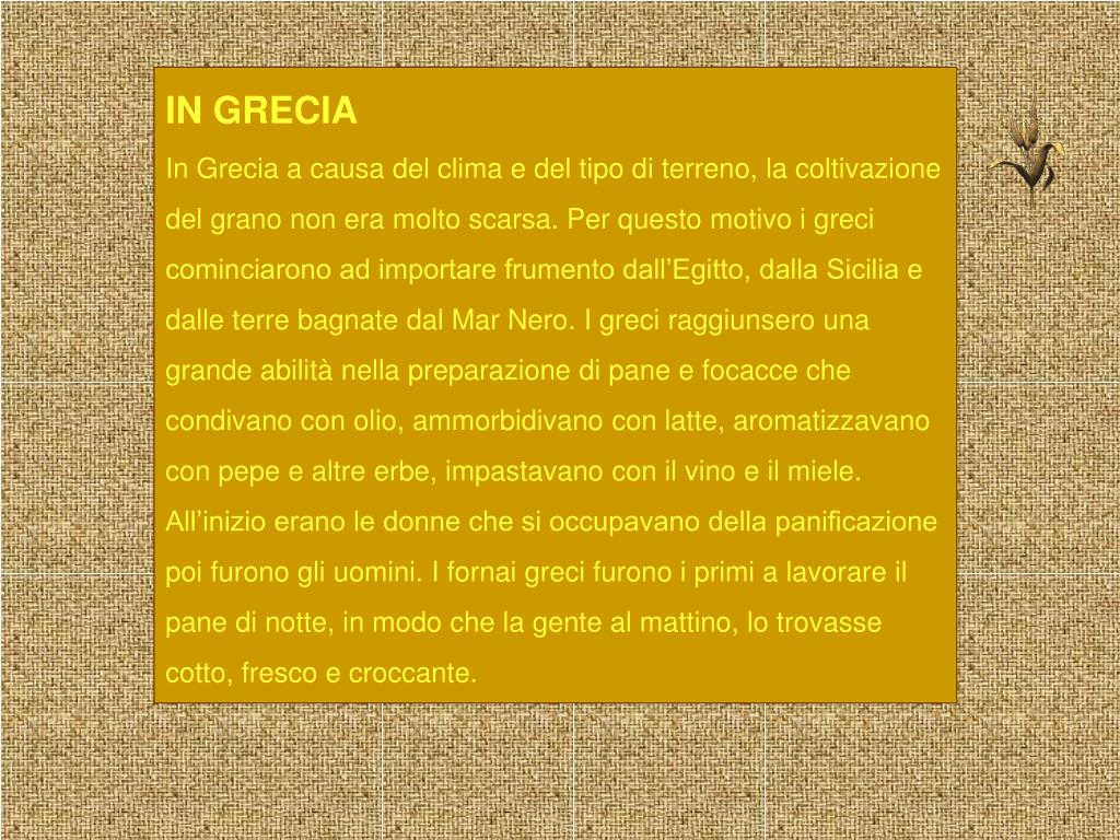 IN GRECIA In Grecia a causa del clima e del tipo di terreno, la coltivazione del grano non era molto scarsa. Per questo motivo i greci cominciarono ad importare frumento dall’Egitto, dalla Sicilia e dalle terre bagnate dal Mar Nero. I greci raggiunsero una grande abilità nella preparazione di pane e focacce che condivano con olio, ammorbidivano con latte, aromatizzavano con pepe e altre erbe, impastavano con il vino e il miele. All’inizio erano le donne che si occupavano della panificazione poi furono gli uomini. I fornai greci furono i primi a lavorare il pane di notte, in modo che la gente al mattino, lo trovasse cotto, fresco e croccante.