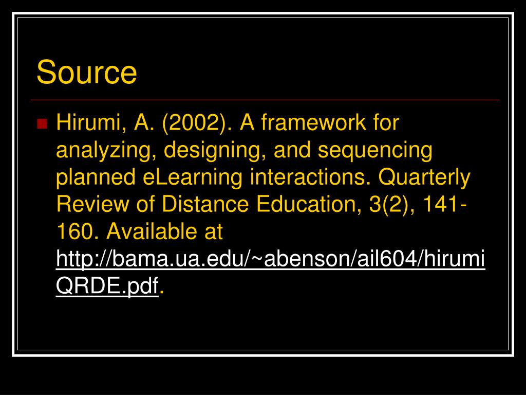 Source • Hirumi, A. (2002). A framework for analyzing, designing, and sequencing planned eLearning interactions. Quarterly Review of Distance Education, 3(2), 141-160. Available at http://bama.ua.edu/~abenson/ail604/hirumiQRDE.pdf.