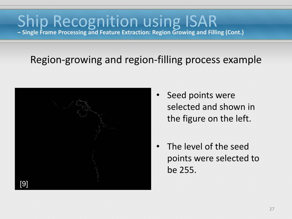 Ship Recognition using ISAR Region-growing and region-filling process It is a simple process used in image segmentation which examines adjacent pixels of the initial “seed points.” Seeds points are locations in the image that are used to select a threshold and to determine where to grow the image from. If a pixel is determined to meet the threshold criteria then the pixel is connected to the seed point. This process continues until there are no more changes left in the image. – Single Frame Processing and Feature Extraction: Region Growing and Filling