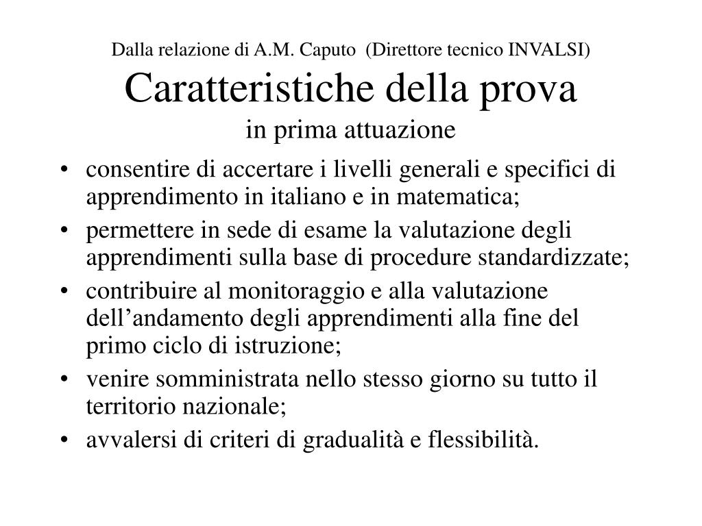 Dalla relazione di A.M. Caputo (Direttore tecnico INVALSI)Caratteristiche della provain prima attuazione • consentire di accertare i livelli generali e specifici di apprendimento in italiano e in matematica; • permettere in sede di esame la valutazione degli apprendimenti sulla base di procedure standardizzate; • contribuire al monitoraggio e alla valutazione dell’andamento degli apprendimenti alla fine del primo ciclo di istruzione; • venire somministrata nello stesso giorno su tutto il territorio nazionale; • avvalersi di criteri di gradualità e flessibilità.