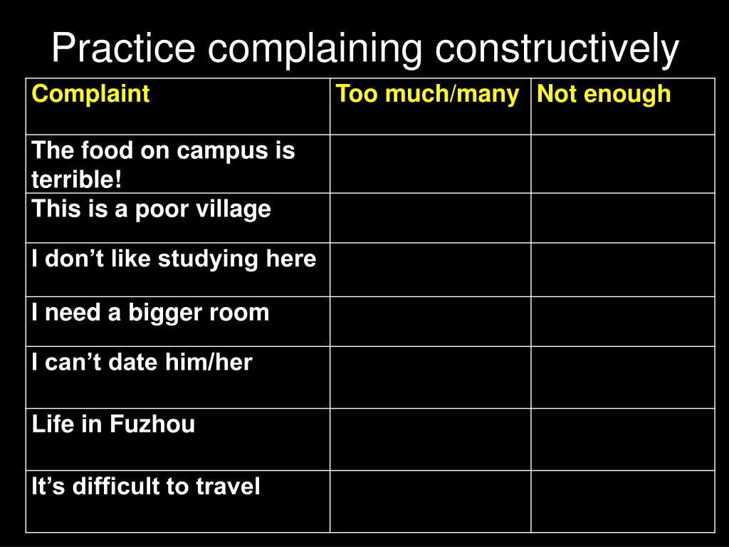 Complaining Constructively Complaints can be helpful if you can provide reasons why something doesn’t work or is unliked problem root cause solution “Too much/many” “Not enough” Much (non count words) Many (count words) Eg. I don’t like this classroom. There’s too much organized activity and not enough time to practice