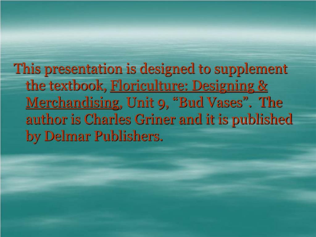 This presentation is designed to supplement the textbook, Floriculture: Designing & Merchandising, Unit 9, “Bud Vases”. The author is Charles Griner and it is published by Delmar Publishers.